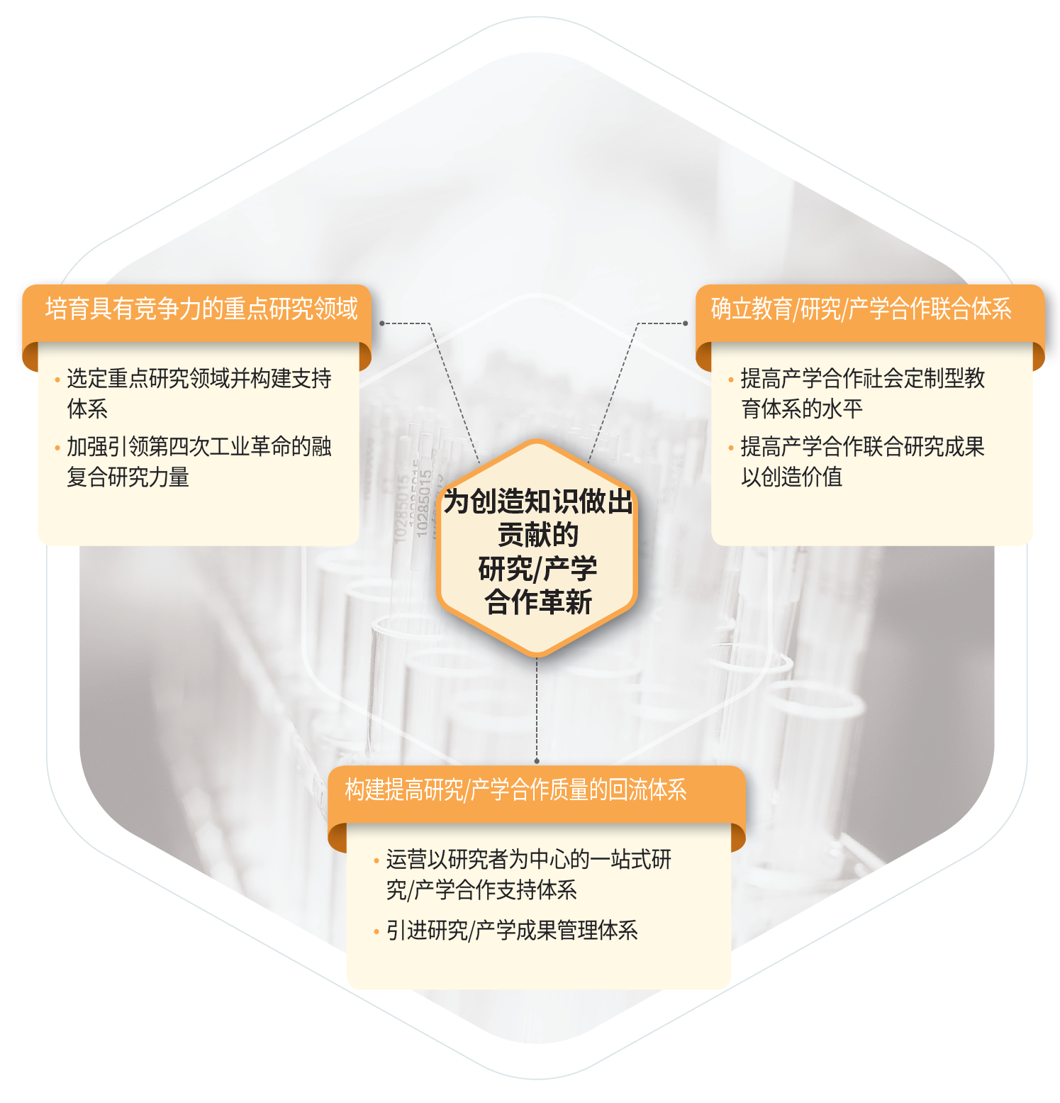 지식창출에 기여하는 연구/산학협력혁신 경쟁력 있는 중점 연구 분야 육성 • 중점 연구분야 선정 및 지원 체계구축 • 4차 산업혁명을 선도하는 융복합연구 역량 강화 为创造知识做出贡献的研究/产学合作革新 培育具有竞争力的重点研究领域 ·选定重点研究领域并构建支持体系 ·加强引领第四次工业革命的融复合研究力量 교육/연구/산학협력 연계 시스템 확립 • 산학협력 사회맞춤형 교육시스템 고도화 • 가치 창출을 위한 산학협력 연계연구 성과 제고 确立教育/研究/产学合作联合体系 ·提高产学合作社会定制型教育体系的水平 ·提高产学合作联合研究成果以创造价值 연구/산학협력 질적 제고를 위한 환류체계 구축 • 연구자 중심 원스톱 연구/산합협력지원 시스템 운영 • 연구/산학 성과 관리 체계 도입 构建提高研究/产学合作质量的回流体系 ·运营以研究者为中心的一站式研究/产学合作支持体系 ·引进研究/产学成果管理体系