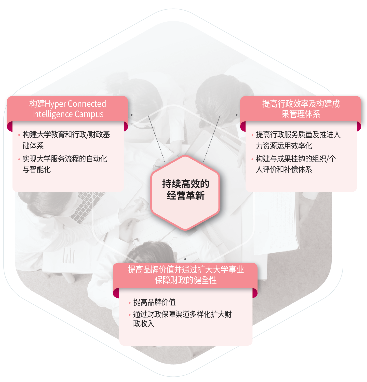 효율적이고 지속적인 경영혁신 Hyper Connected Intelligence Campus 구축 • 대학 교육 및 행/재정 기반시스템 구축 • 대학 서비스 프로세스의 자동화및 지능화 持续高效的经营革新 构建Hyper Connected Intelligence Campus ·构建大学教育和行政/财政基础体系 ·实现大学服务流程的自动化与智能化 행정의 효율화와 성과관리 체계 구축 • 행정서비스 질적 제고 및 인력운용 효율화 추진 • 성과와 연계한 조직/개인의평가와 보상 체계 구축 提高行政效率及构建成果管理体系 ·提高行政服务质量及推进人力资源运用效率化 ·构建与成果挂钩的组织/个人评价和补偿体系 브랜드가치 제고 및 대학사업 확대로 재정건전성 확보 • 브랜드 가치 제고 • 재정 확보 채널의 다양화로 재정수입확대 提高品牌价值并通过扩大大学事业保障财政的健全性 ·提高品牌价值 ·通过财政保障渠道多样化扩大财政收入