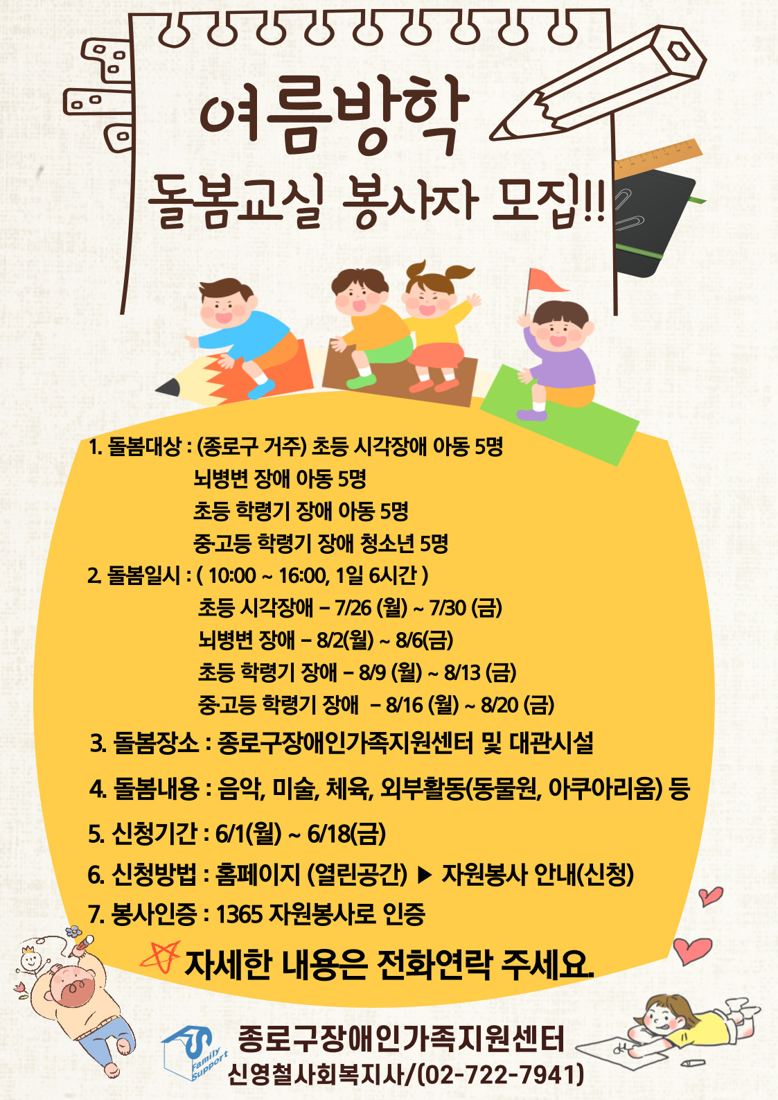 - [교육봉사] 종로구장애인가족지원센터 여름방학돌봄 봉사자 모집