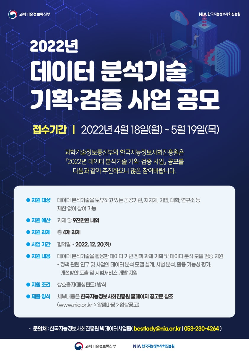 - [한국지능정보사회진흥원] 2022년 데이터 분석기술 기획·검증 사업 공고 안내
