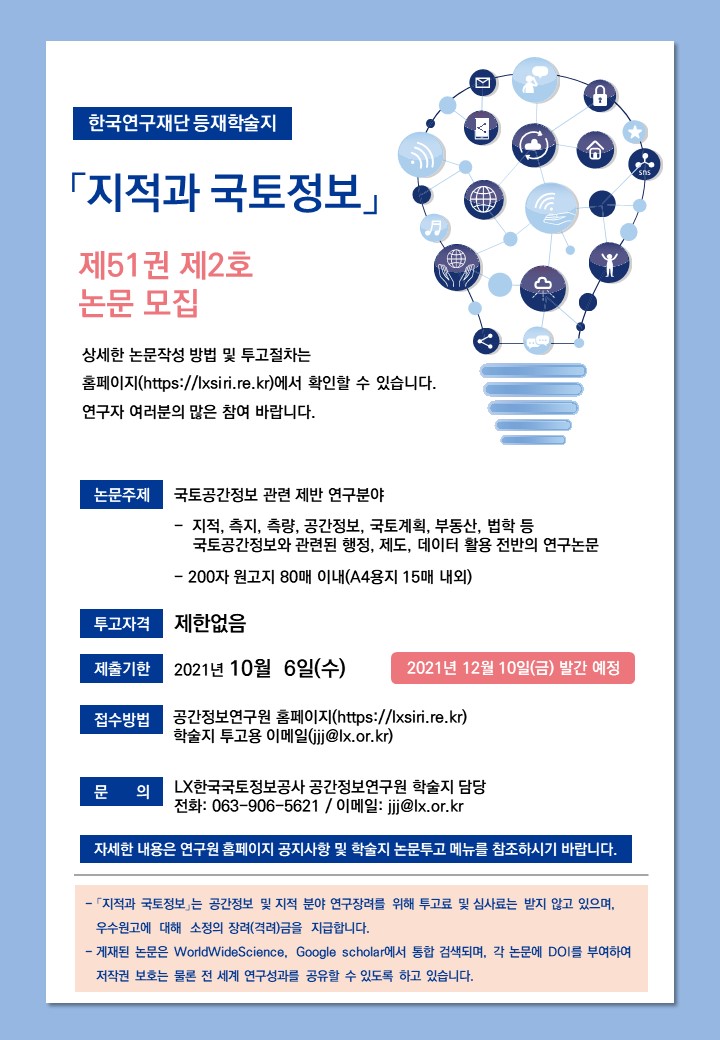 - [일반공지] [한국국토정보공사] LX공간정보연구원 학술지 <지적과 국토정보> 2021년 하반기 논문 모집 안내