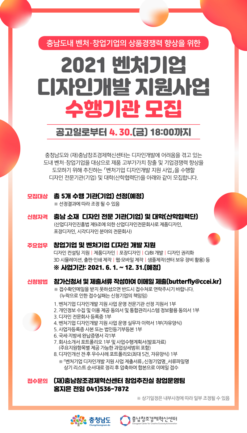 - [충남창조경제혁신센터] 2021년 충남 벤처기업 디자인개발 지원사업 수행기관 모집안내