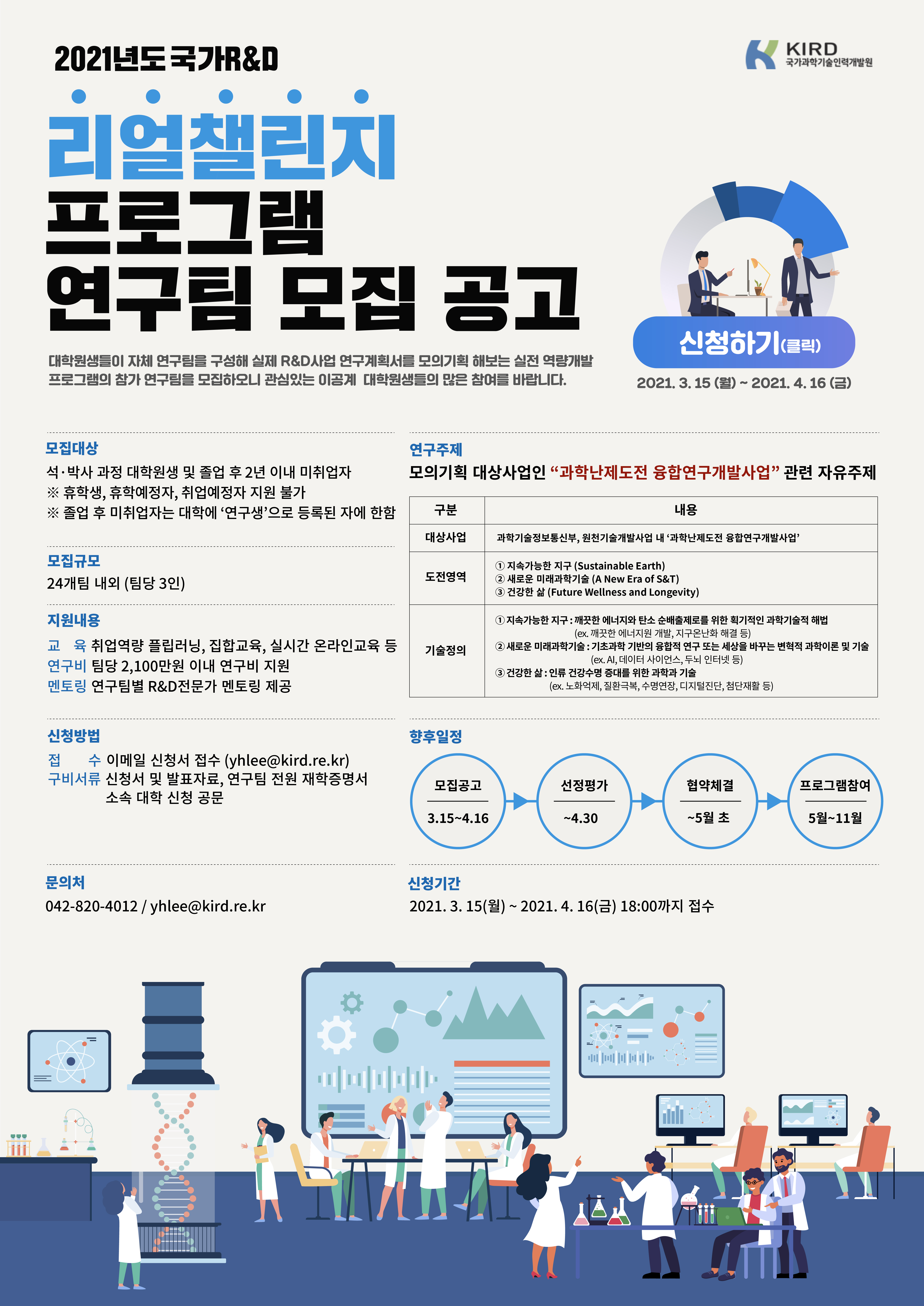 - [국가과학기술인력개발원] 국가R&D 리얼챌린지 프로그램 연구팀 모집 안내