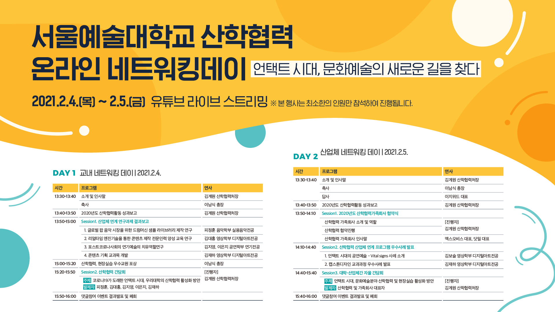 - [일반공지] [서울예술대학교] 2020학년도 서울예술대학교 산학협력 온라인 네트워킹데이 및 성과발표회 안내