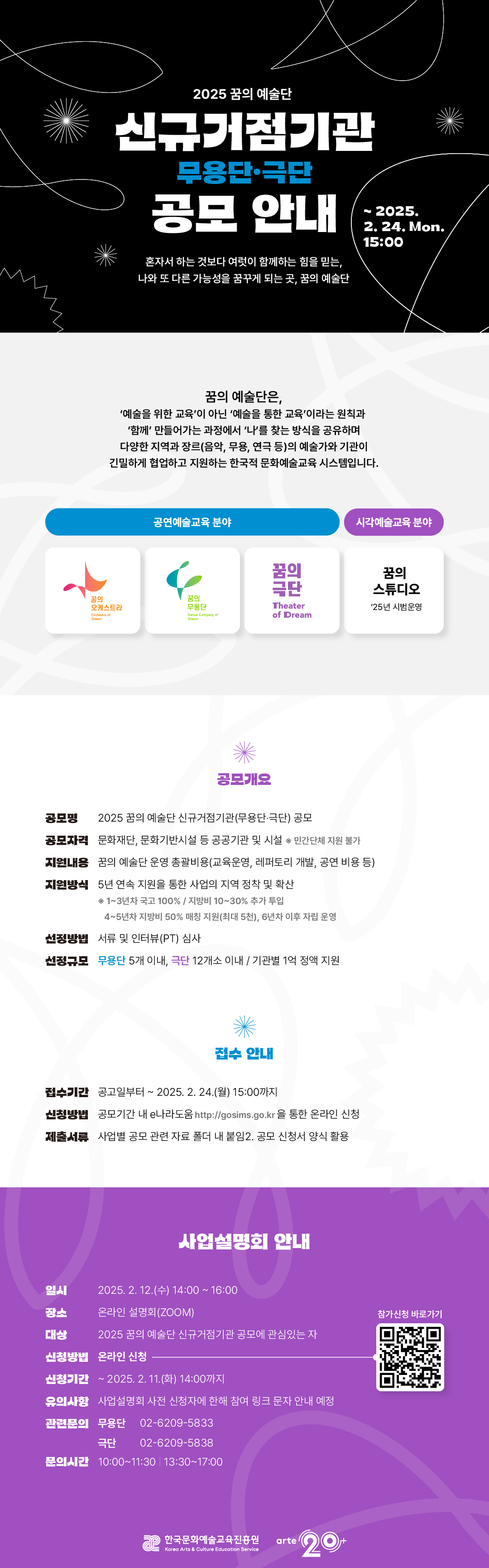 - (한국문화예술교육진흥원)「2025 꿈의 예술단(무용단, 극단)」 신규거점기관 공모