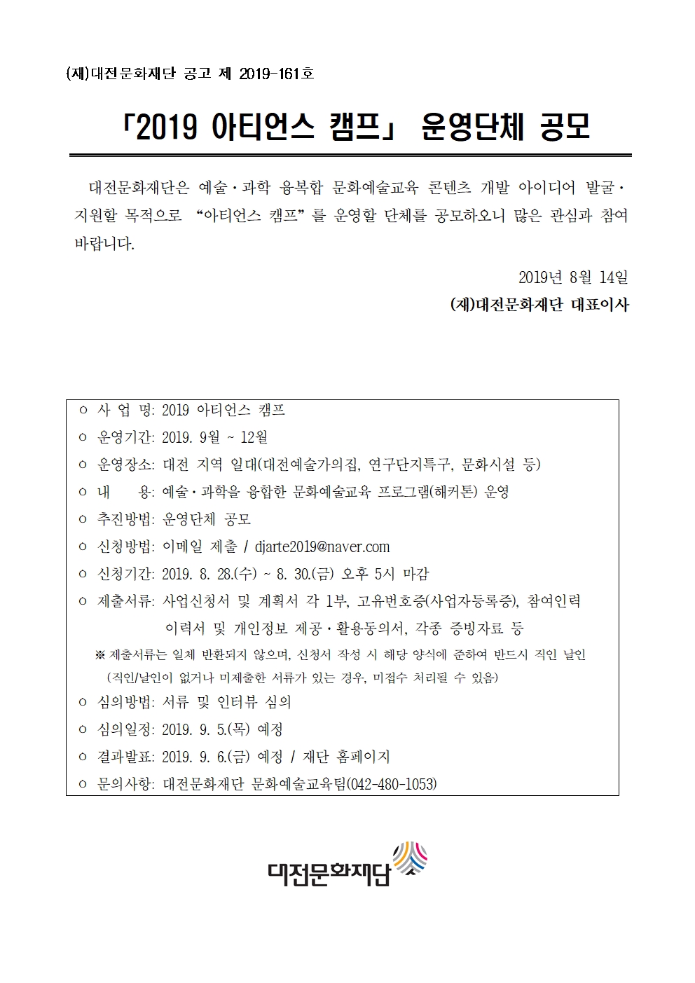 - [재단법인 대전문화재단] (재)대전문화재단 「2019 아티언스 캠프」운영단체 공모 안내
