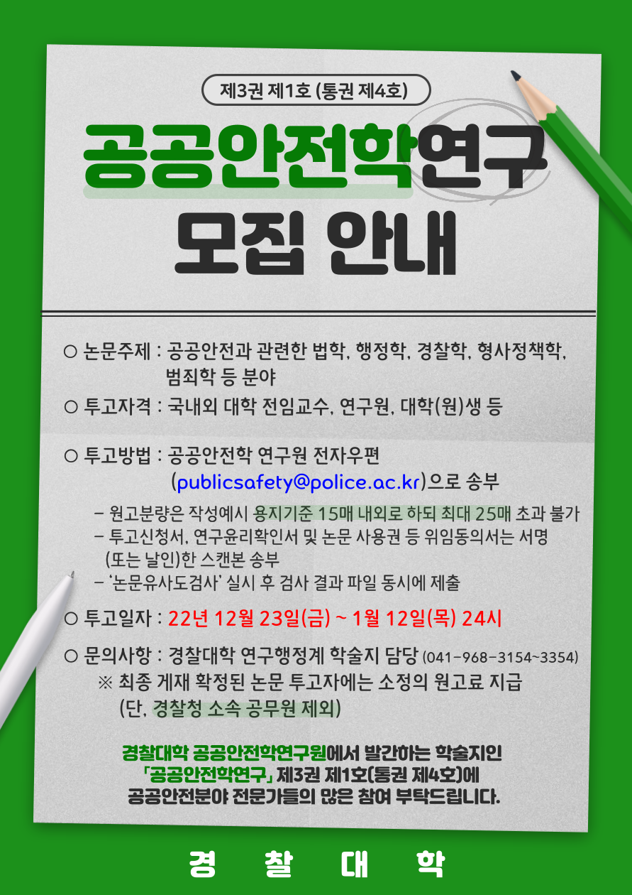 - [일반공지] [경찰대학] 경찰대학 공공안전학연구원 학술지「공공안전학연구」제3권 제1호(통권 제4호) 논문 공모 안내