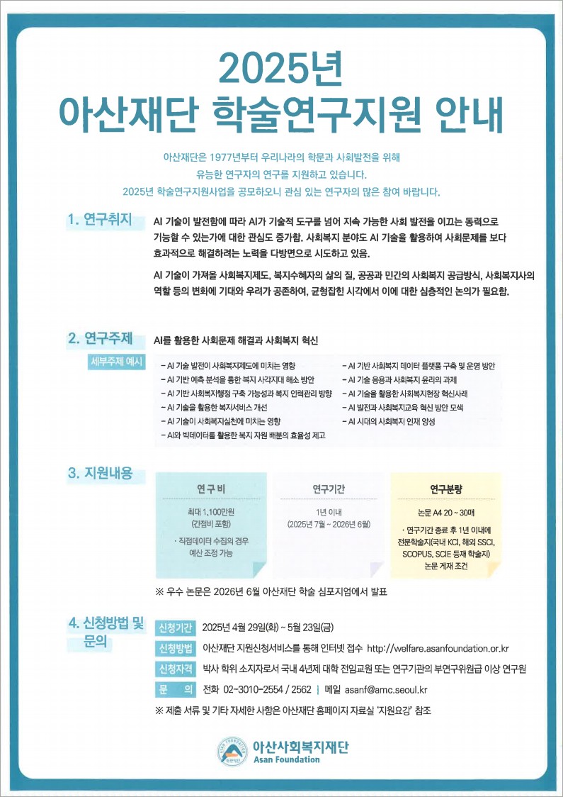 - [재단법인 아산사회복지재단] 2025년 아사재단 '학술연구 지원사업 안내'