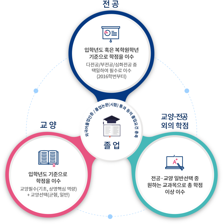 교양: 입학년도 기준으로 학점을 이수 교양필수(기초, 상명핵심 역량) + 교양선택(균형, 일반)