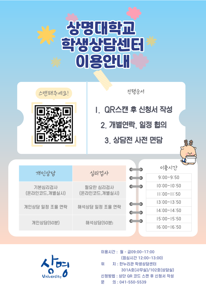 천안 [학생생활] [학생상담센터(천안)] 개인상담 및 심리검사 신청 안내 -