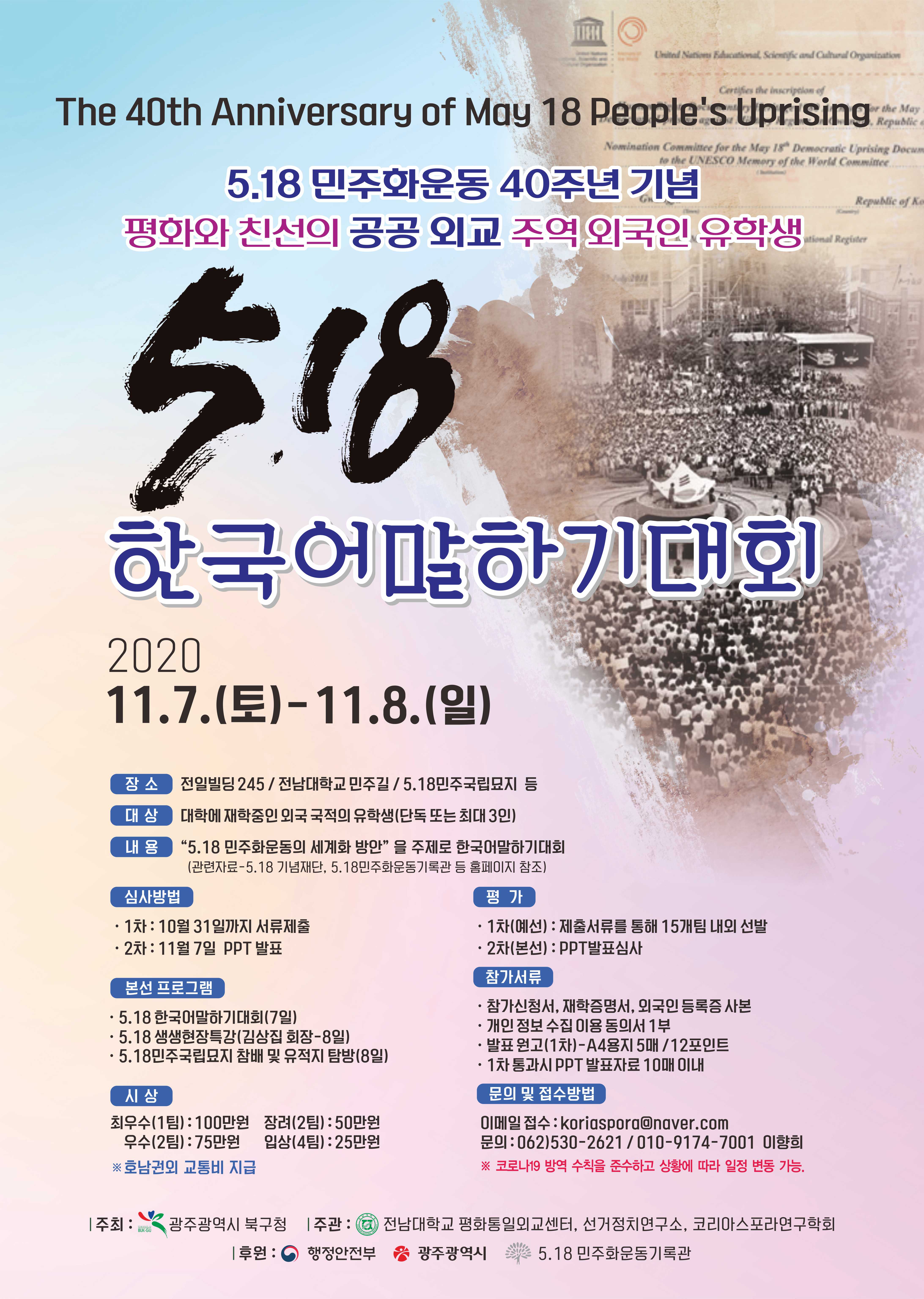 - 5·18 40주년 기념 「2020년 외국인 유학생 5·18 한국어 말하기 대회」 개최 안내